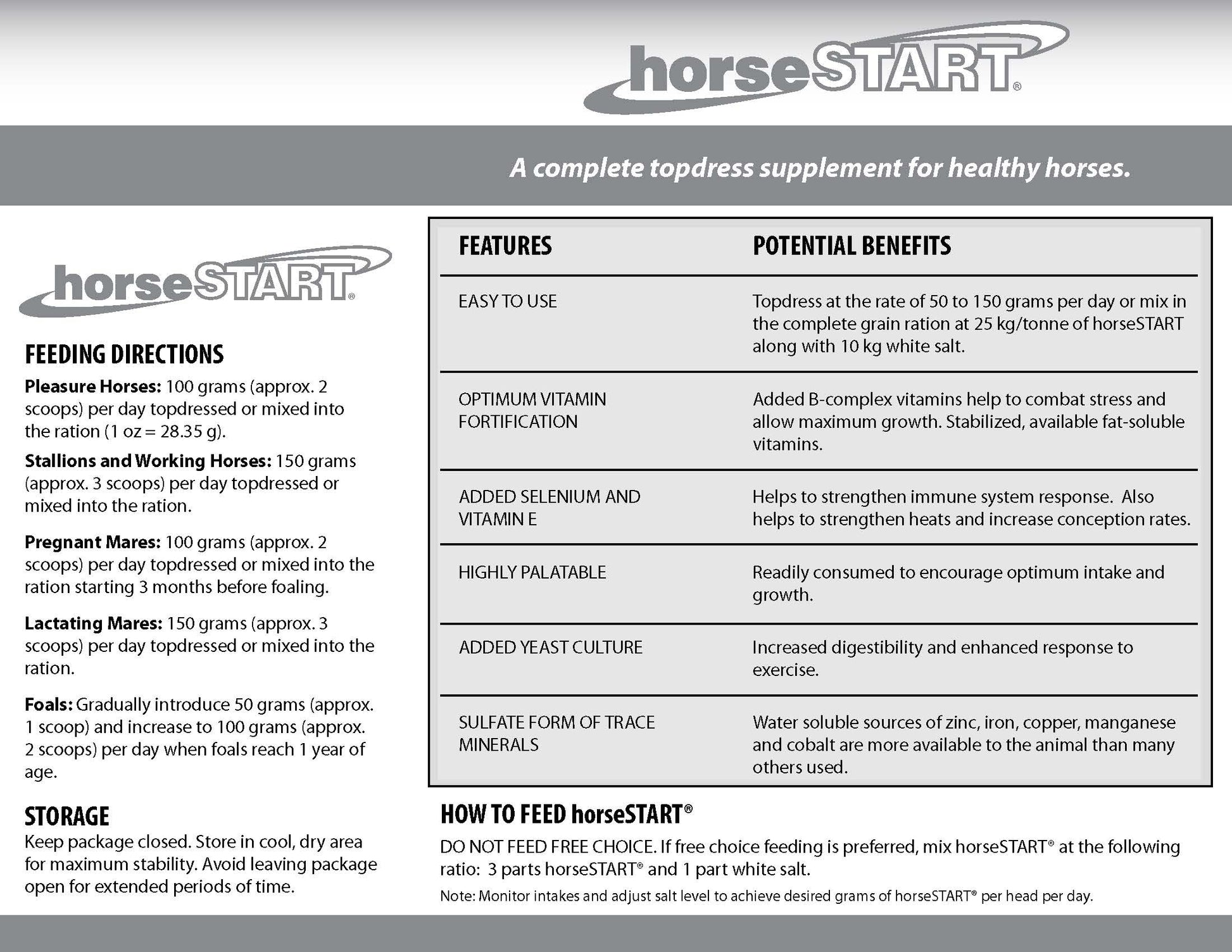 Stallions and Working Horses: 150 grams (approx. 3 scoops) per day topdressed or mixed into the ration.